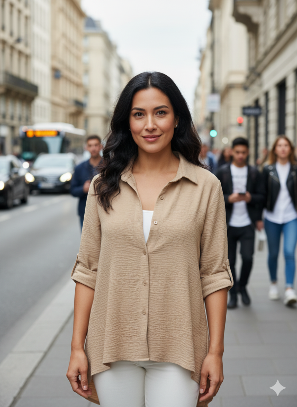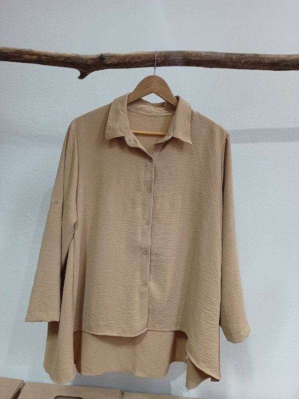 CAMISA OVERSIZE MANGA LARGA, CON PRESILLAS, COLOR TOSTADO. DE CREPPE LISO.